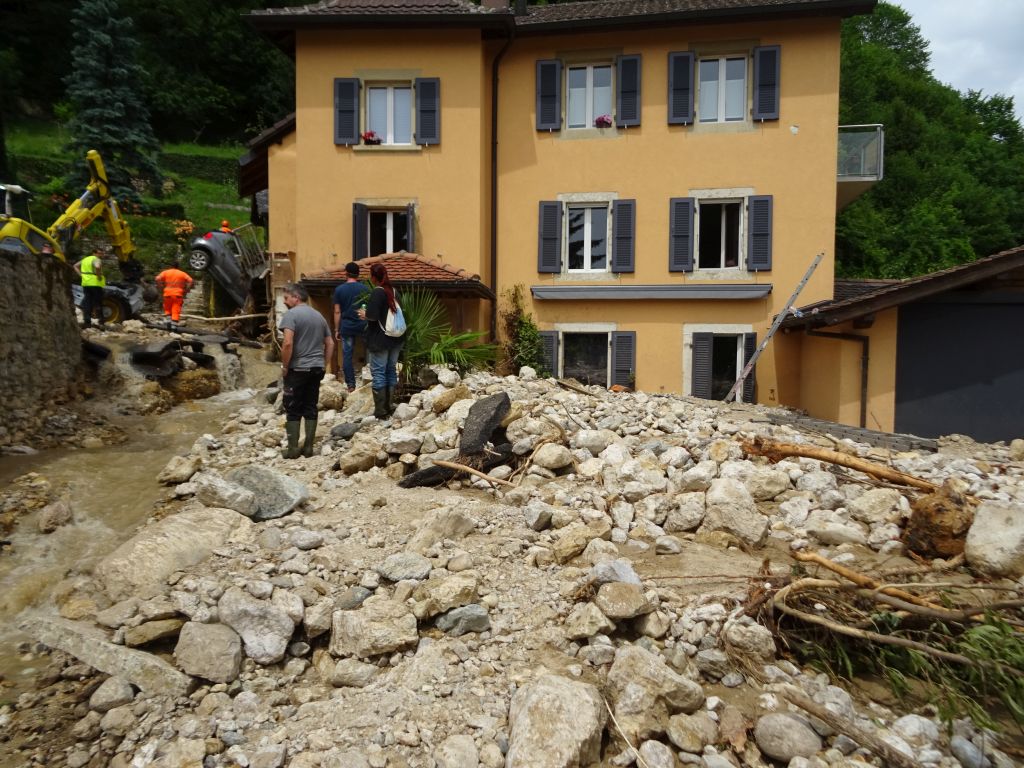 - Schadensbild: Massive Schäden in Cressier ausgelöst durch den Bach Le Ruhaut zwischen 20:15 Uhr und 21:30 Uhr.